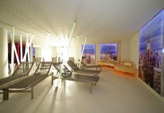 새로운 맨하탄-북부 웰니스 지역의 문턱을 넘어선 방문객들은 비엔나의 지붕이 아니라 뉴욕 맨해튼의 스카이 라인을 볼 수 있습니다. 맨해튼 스카이 라인 사진은 백라이트를 통해 낮부터 밤까지의 전환을 재현합니다. "우리의 새로운 휴식공간은 시간을 초월합니다. 방문객들은 일상에서 휴식을 취하여 언제든지 원더랜드에 빠져들 수 있습니다. 맨하탄 피트니스 센터의 관리자인 Gehard Span은 다음과 같이 설명합니다. “일출에서 일몰로의 전환은 일상 생활에서 벗어나는 방법입니다” 디자이너 Alice Koller는 이 테마가 사우나 공간의 디자인에 의도적으로 반영되어 있다며 다음과 같이 얘기합니다. “픽업 스틱과 같이 천장에 매달려 있는 빛나는 실린더를 사용하는 것은 놓아주는 것을 상징하며, 계단식 조명은 라운지 공간에 편안한 느낌을 줍니다”