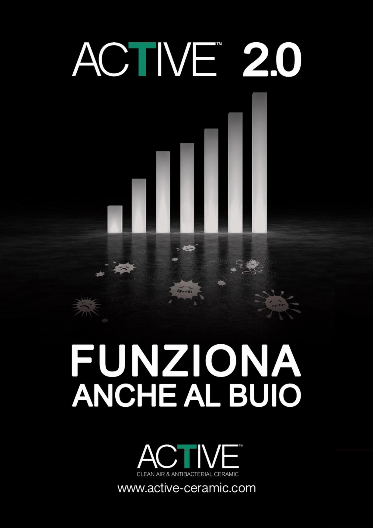 이산화 티타늄과 은이 결합된 혁신적인 물질을 만들었습니다. 세라믹 표면에 적용된 이 새로운 조합의 물질은 Active 제품이 LED 조명 아래서도 지속적으로 높은 성능을 유지하며, 광촉매와 은이 결합된 작용으로 인해 어둠속에서도 항균 특성을 24시간 유지합니다.